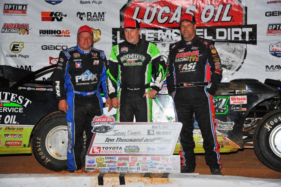 By Lucas Oil Late Model Series PR (Tazewell, TN) -- Jimmy Owens used his outside front row starting spot for the Toyota Knoxville 50 to his full advantage - winning the Lucas Oil Late Model Dirt Series-sanctioned event on Sunday night at Tazewell Speedway.