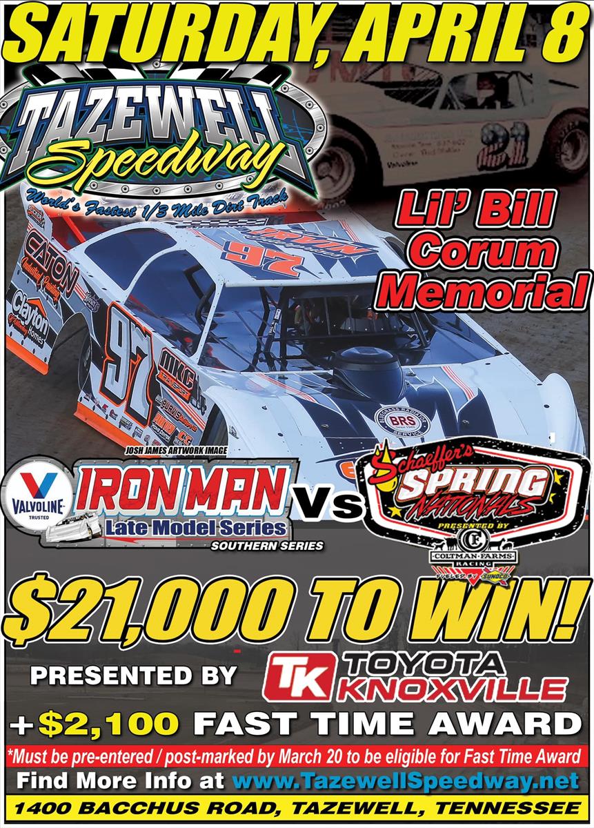 For more information on Tazewell Speedway, log on to www.TazewellSpeedway.net . For more information on the Valvoline Iron-Man Late Model Series, log on to www.IMDIRT.net and for more information on the Spring Nationals Series, log on to www.SouthernNationalsSeries.com .