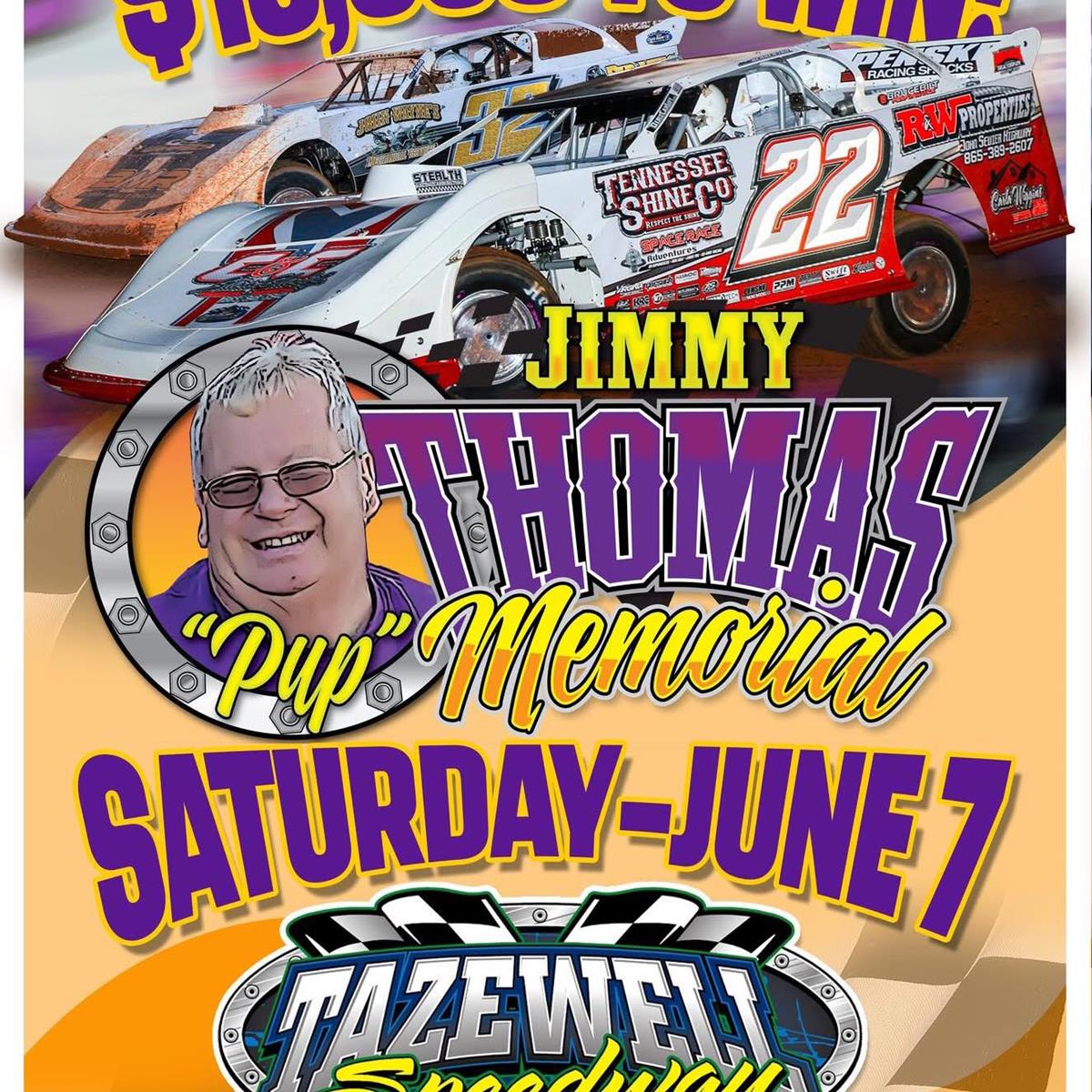 The next race at Tazewell Speedway will be Saturday, June 7 when the Rogers-Dabbs Performance Parts Crate Racin’ USA Dirt Late Model Series returns for the Jimmy "Pup" Thomas" Memorial for $10,000 to win.